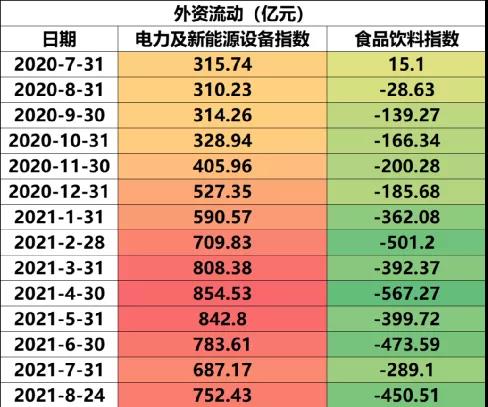 如果你持續(xù)跟蹤外資,就會(huì)發(fā)現(xiàn)從2016年陸股通開通之后,外資一直抱團(tuán)大消費(fèi)板塊,直到2020年8月,外資突然第一次出現(xiàn)資金的凈流出。而那個(gè)時(shí)候,很多散戶還在高位擁抱食品飲料。